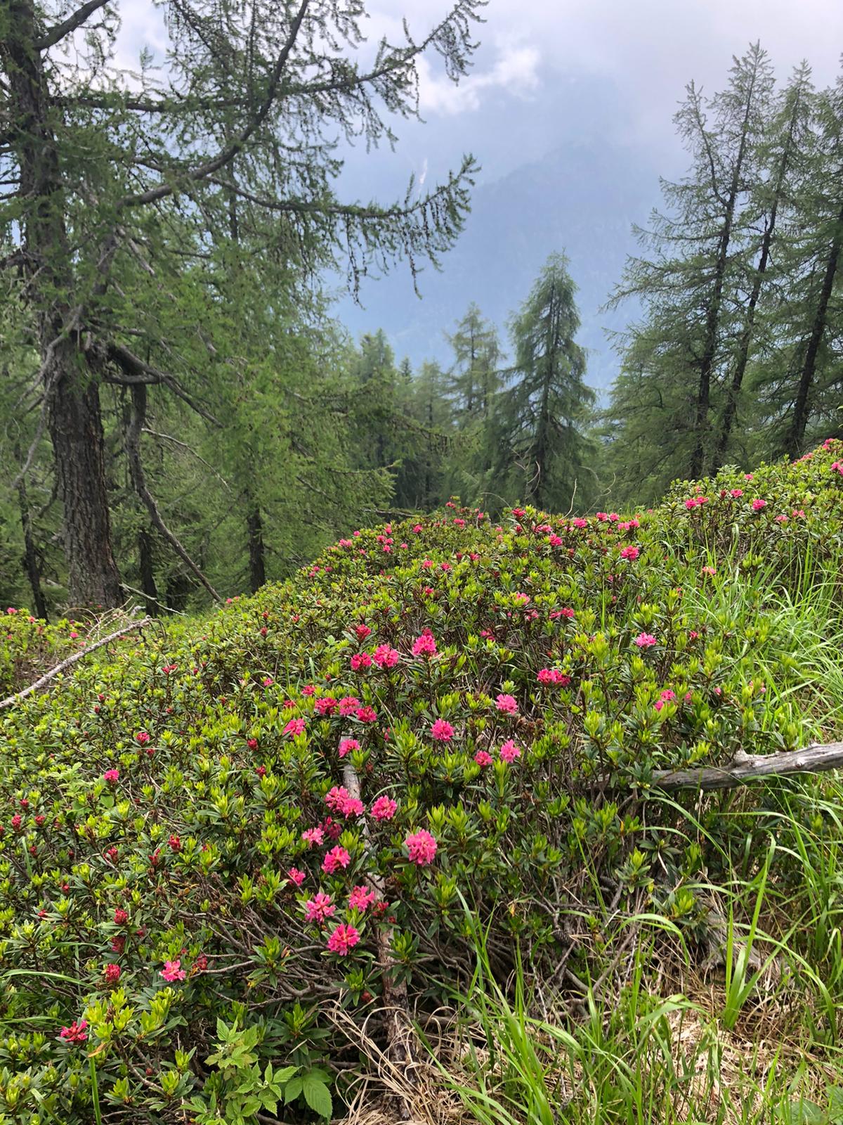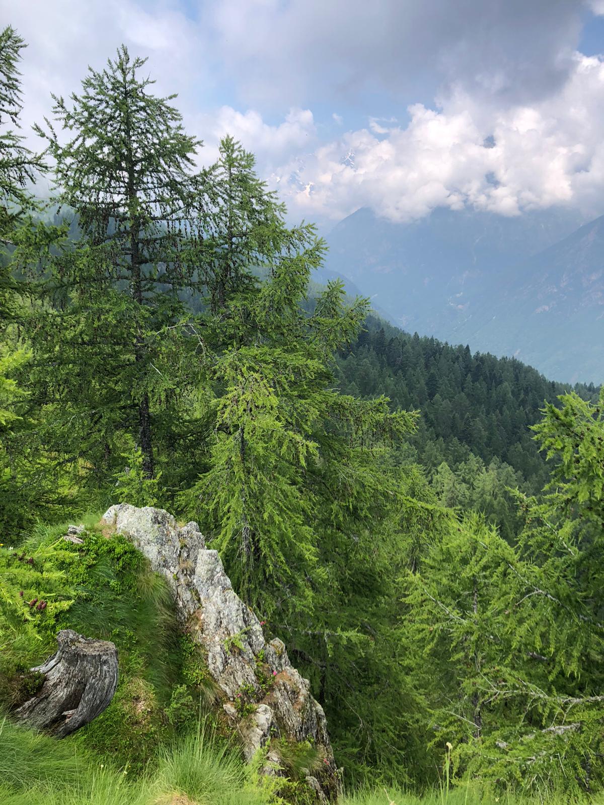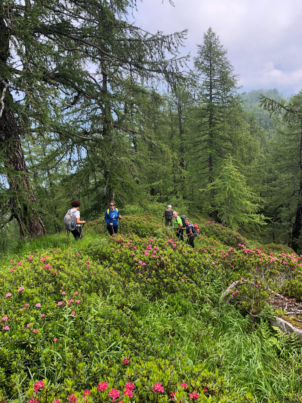 Da Pontegrande saliamo a Bannio e qui imbocchiamo la strada per l’alpe Soi. Posteggiamo all’altezza dell’alpe La Piana, quota 908. Di qui sale una strada per l’alpe Balm Cima, che si raggiunge in pochi minuti. Incontriamo dei cani, molto incazzati e fortunatamente ben legati, che si occupano di un grande gregge di ovini e caprini che staziona nel ripido bosco al disotto della strada. Saliamo a sinistra, fra le baite, lungo il sentiero abbastanza evidente che ci porta rapidamente all’Alpe Provaccio, 1130, dove i ruderi dei vecchi impianti da sci continuano a deturpare tanta bellezza. Ci godiamo una bellissima vista sulla Est del Monte Rosa. Il sentiero B 19 prosegue nel bosco che costeggia il vecchio tracciato dello skilift e ci porta all’Alpe Loro, quota 1336. Camminiamo su pendenze raramente “cattive”, quasi sempre all’ombra, passando per gli alpeggi della Rausa di Bannio, 1386, Rausa di San Carlo, 1486, e Ielbi, fino a Villa Samonini, 1638. La fatica è poca e l’ambiente è quello delle favole che ci raccontava la nonna macugnaghese: rododendri, prati fioriti, abeti, faggi, bellissime baite, minuscoli laghetti, serafiche vacche al pascolo. Raggiungiamo, e me la gusto finalmente, la bella conca di Campo Aostano.