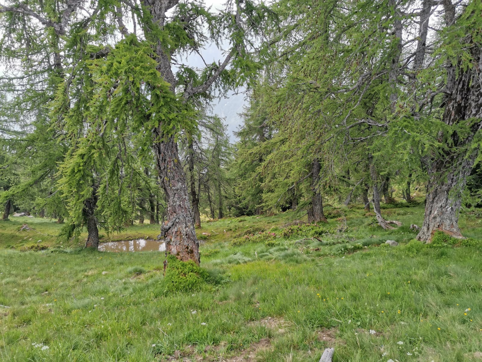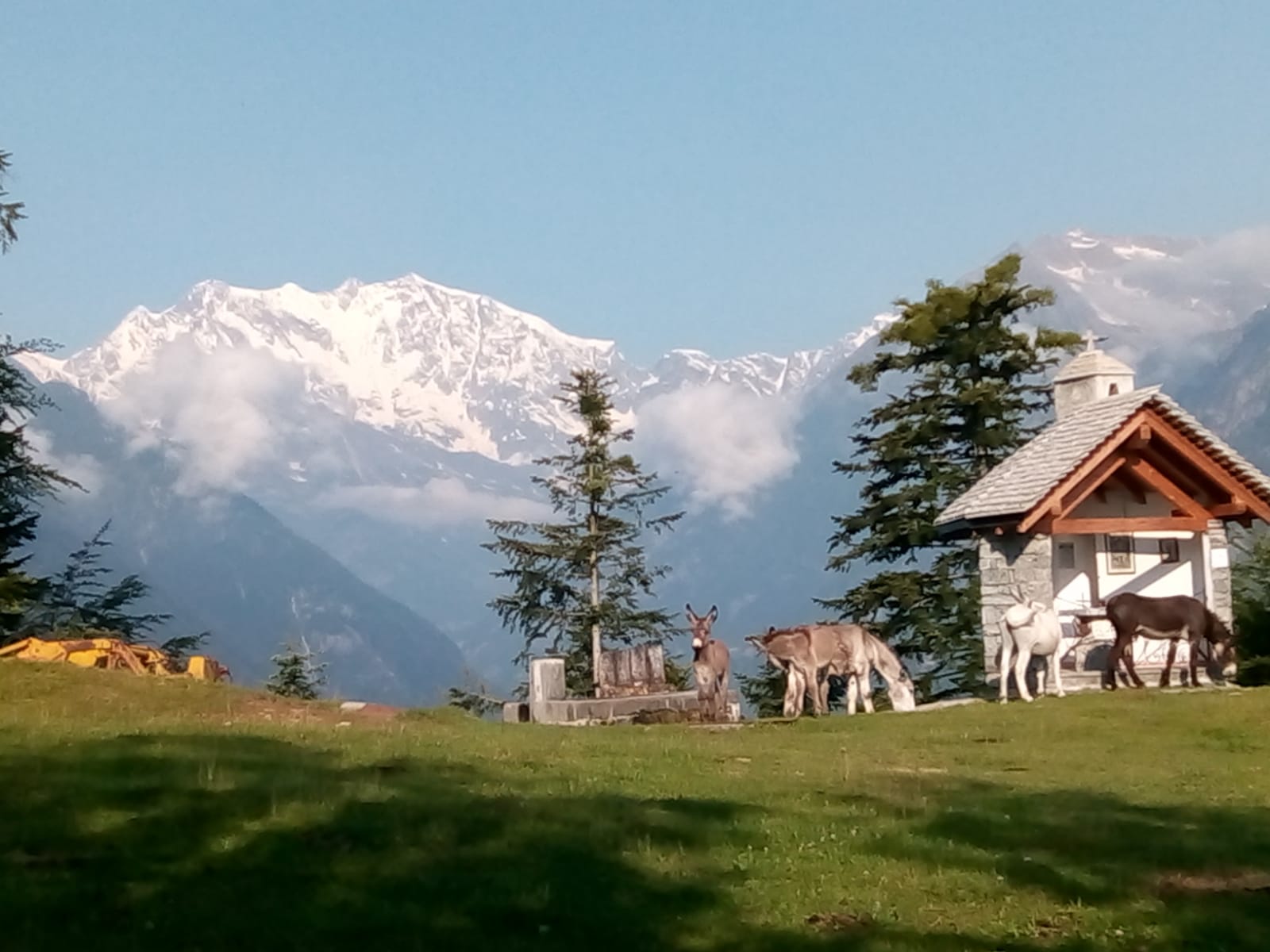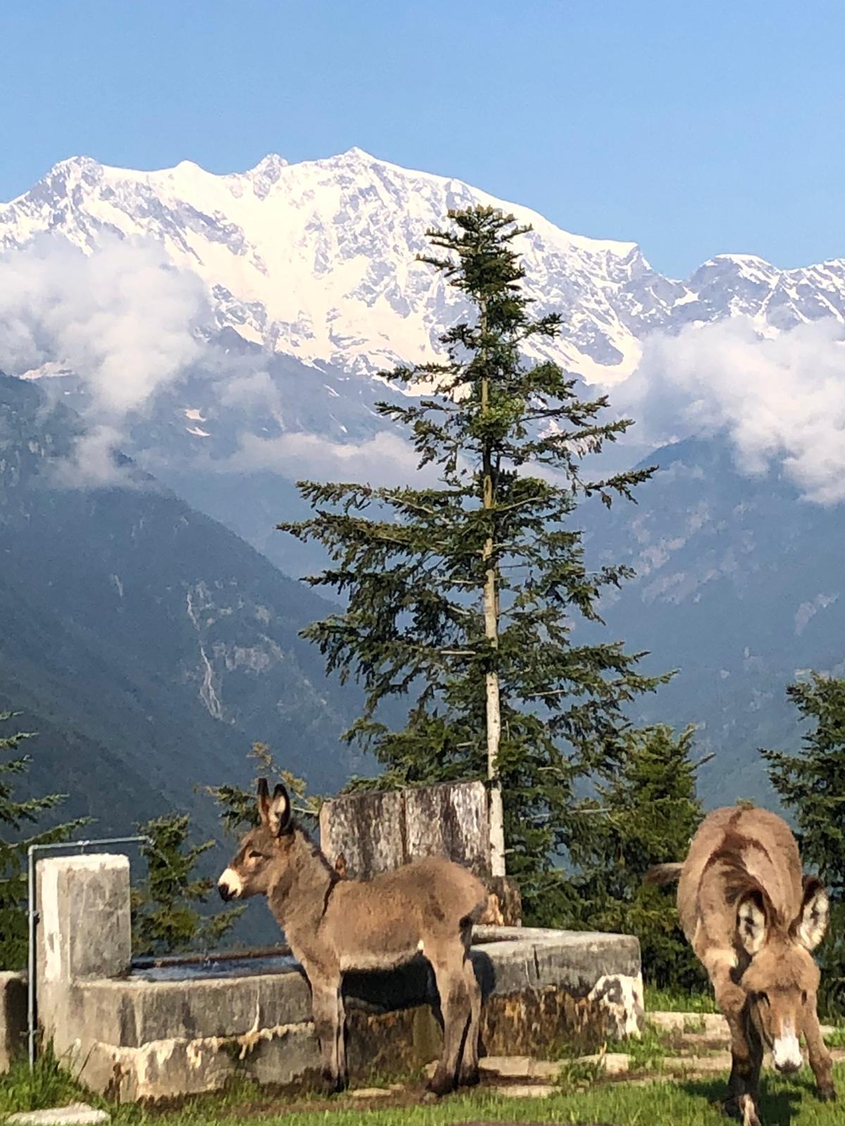 Da Pontegrande saliamo a Bannio e qui imbocchiamo la strada per l’alpe Soi. Posteggiamo all’altezza dell’alpe La Piana, quota 908. Di qui sale una strada per l’alpe Balm Cima, che si raggiunge in pochi minuti. Incontriamo dei cani, molto incazzati e fortunatamente ben legati, che si occupano di un grande gregge di ovini e caprini che staziona nel ripido bosco al disotto della strada. Saliamo a sinistra, fra le baite, lungo il sentiero abbastanza evidente che ci porta rapidamente all’Alpe Provaccio, 1130, dove i ruderi dei vecchi impianti da sci continuano a deturpare tanta bellezza. Ci godiamo una bellissima vista sulla Est del Monte Rosa. Il sentiero B 19 prosegue nel bosco che costeggia il vecchio tracciato dello skilift e ci porta all’Alpe Loro, quota 1336. Camminiamo su pendenze raramente “cattive”, quasi sempre all’ombra, passando per gli alpeggi della Rausa di Bannio, 1386, Rausa di San Carlo, 1486, e Ielbi, fino a Villa Samonini, 1638. La fatica è poca e l’ambiente è quello delle favole che ci raccontava la nonna macugnaghese: rododendri, prati fioriti, abeti, faggi, bellissime baite, minuscoli laghetti, serafiche vacche al pascolo. Raggiungiamo, e me la gusto finalmente, la bella conca di Campo Aostano.