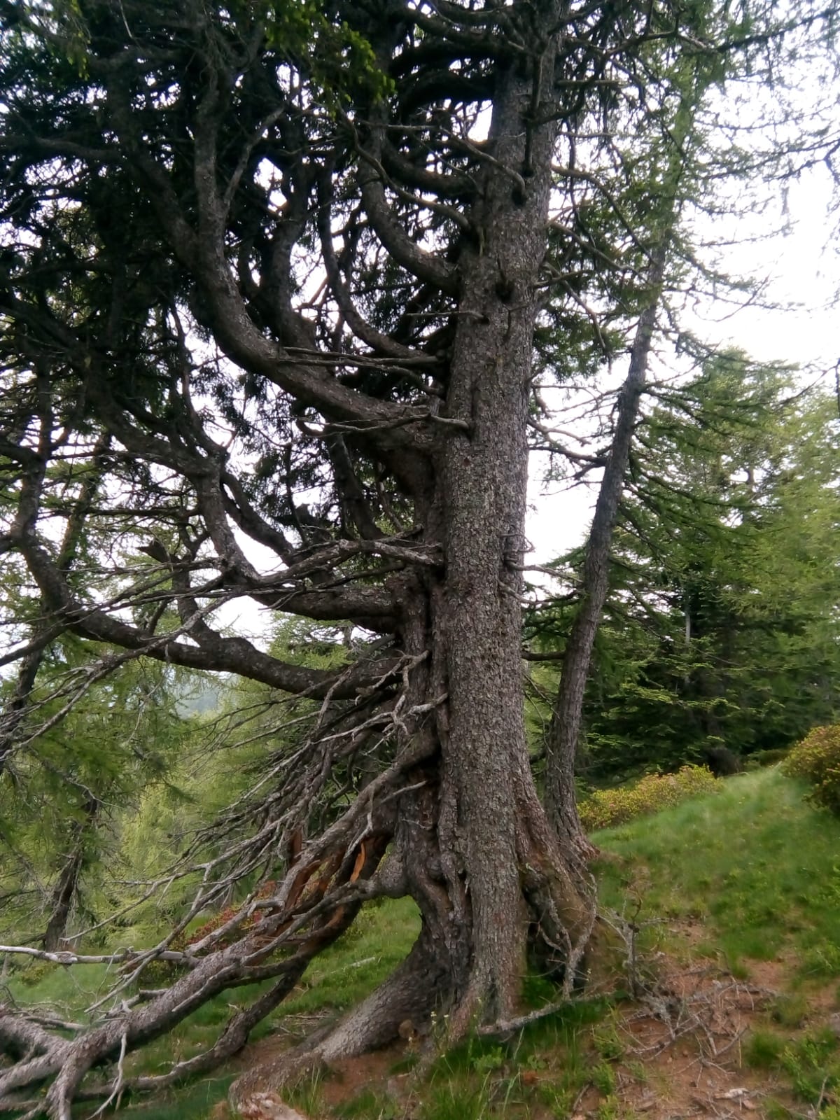 Di qui ero già passato in inverno, ma senza rendermene conto. Campo Aostano fu sede di violenti scontri fra anzaschini, valsesiani, svizzeri e aostani che si contendevano alpeggi e pascoli e di una vera e propria battaglia, nel 1411, allorché gli svizzeri, calati dal Monte Moro, tentarono di strappare questa terra al Vescovo di Novara. Il sentiero attraversa la conca e, virando a oriente, risale in breve alla vetta del Pizzetto, 1879, un po’ più spaziosa che in inverno, ma non troppo. Camminiamo da circa tre ore. Adesso il Rosa è coperto quasi totalmente da fastidiose nuvole che ci privano dello scorcio più suggestivo delle Alpi Pennine. Con percorso più o meno libero verso settentrione, innescato da una traccia che poi si perde in mezzo ai rododendri, recuperiamo il sentiero principale e torniamo a Villa Samonini.